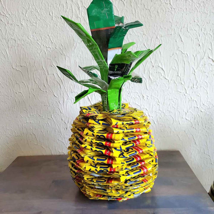 I also collect beach trash and work with those materials separately from the household trash items. The work I make from beach trash, I believe, has a certain resonance to it since it shines a light on the plastic pollution in our oceans and how imbedded it is in our environment. I work on a small scale with these materials since I could never keep up with processing the amount of plastic we pull from the beaches. I keep a selection of favorite and common beach items for my work. We now have a geographical layer of plastic on the earth’s crust. Plastic is filling the bodies of 90% of fish and mammals in the ocean and we even have plastics in our own blood.