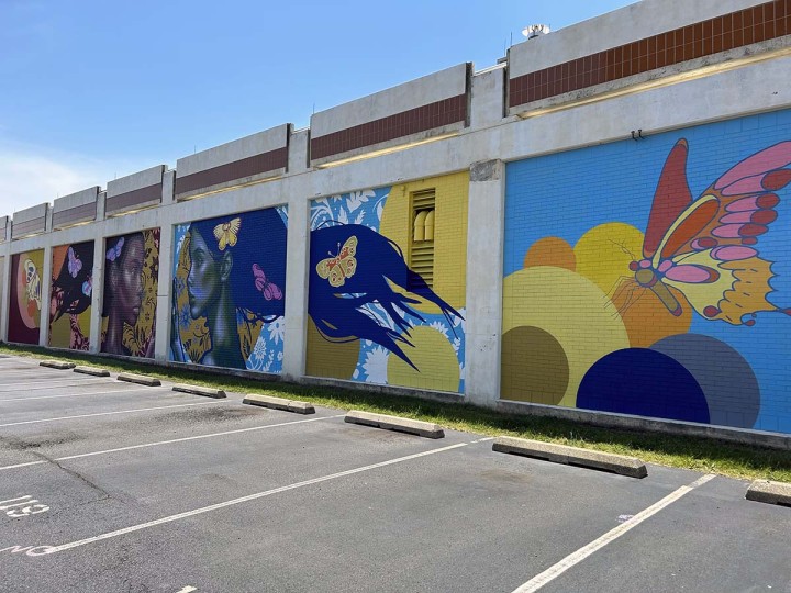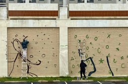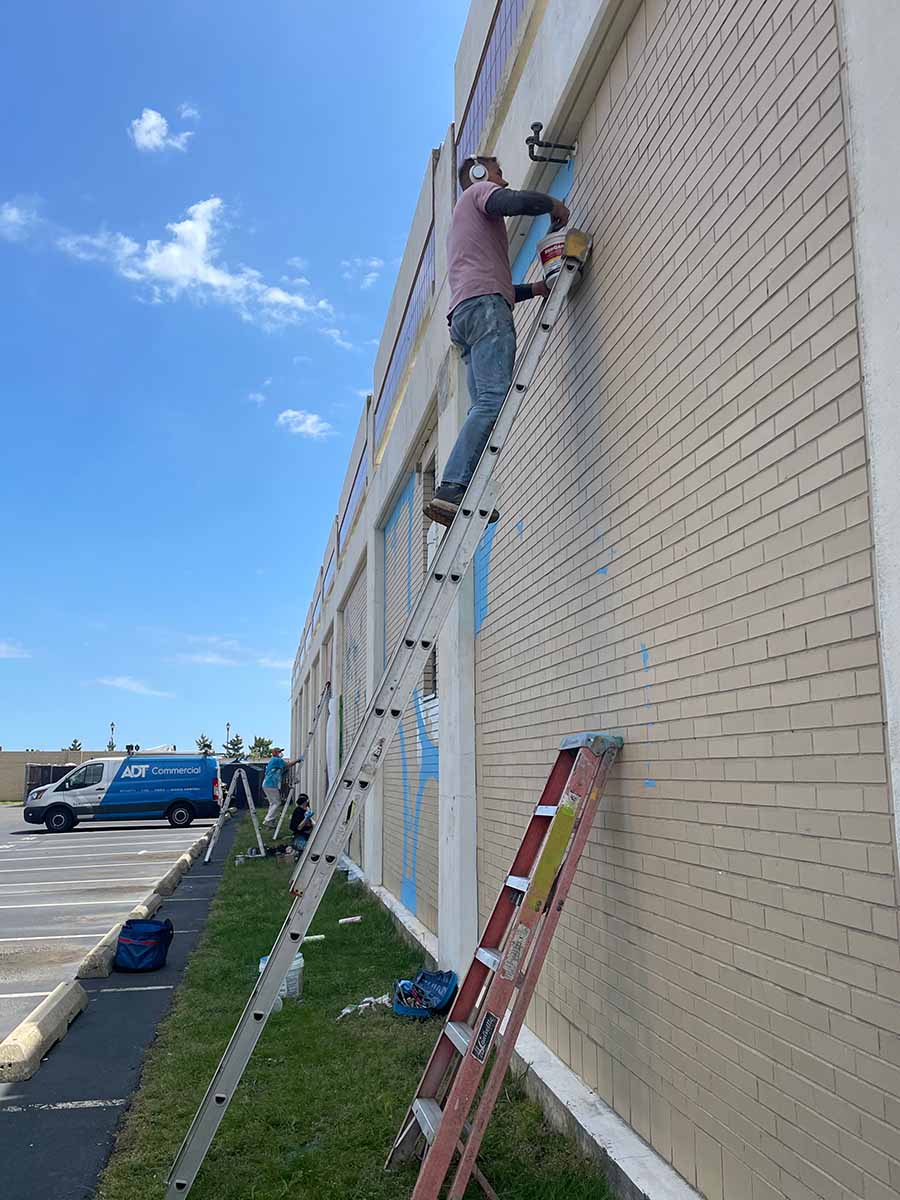Due to the popularity of prior phases of the project, the City of Asbury Park’s Public Art Commission is continuing the mural project on the city-owned Wastewater Treatment Facility on the north end of the boardwalk. The third phase of the project is on the north wall of the Treatment Facility facing Asbury Tower, a senior living apartment complex. The residents of Asbury Tower were engaged in the final selection after the Public Art Commission issued a call for artists to paint one large concept across multiple panels. The winning selection ended up being a collaboration between the two artists whose individual submissions tied for top vote: Courtney Pasterchick and Bradley Hoffer.