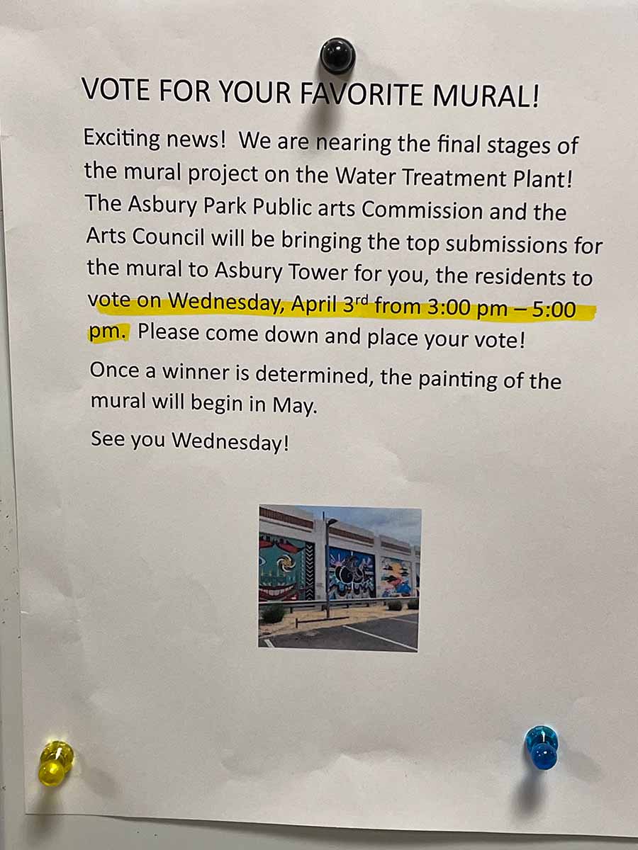 Work on the mural started in early May and is slated to be complete before the end of the month. An artist Meet & Greet was held on May 14th for Asbury Tower residents to meet the artists and ask questions about their work. APAC is assisting in the 2024 project by providing logistical support to the Public Art Commission.