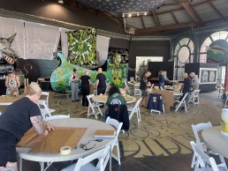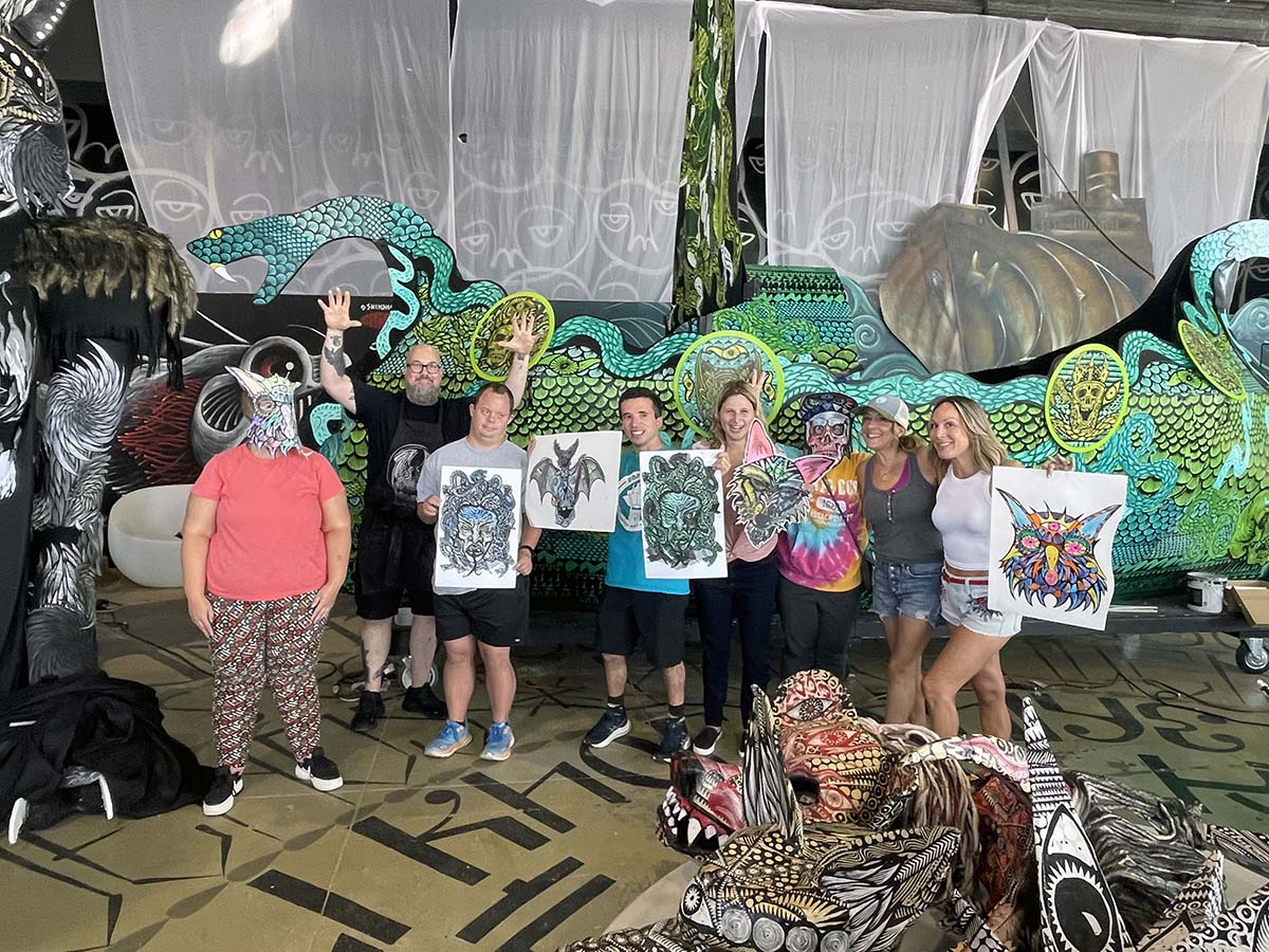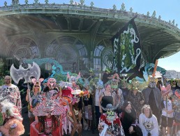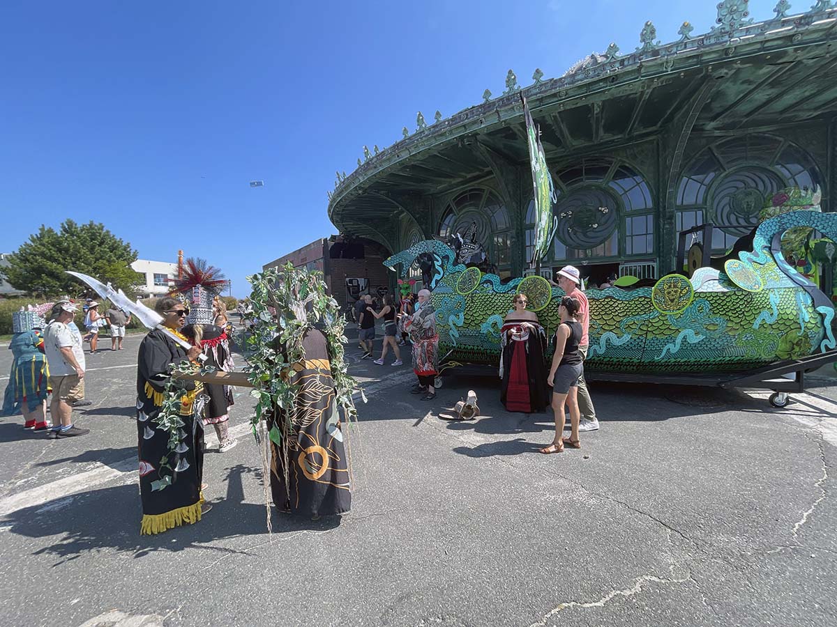 In September, the Wooden Walls Public Art Project hosted Virginia-based artist Dennis McNett, aka Wolfbat, for a second year as part of their Carousel Art House programming on the boardwalk. McNett, a printmaker with a body of work ranging from masks, installations and sculptures to unique hand-carved wood cut pieces, traditional relief prints, and graphics, spent a week creating a 24-ft long viking ship and held a weeklong mask making workshop with the public. The residency culminated in the “March of the Medusa II” on the boardwalk that included the viking ship, two 12-foot puppets the artist previously constructed, workshop participants in their masks, and local band, the Ocean Avenue Stompers, with music composed especially for the March.