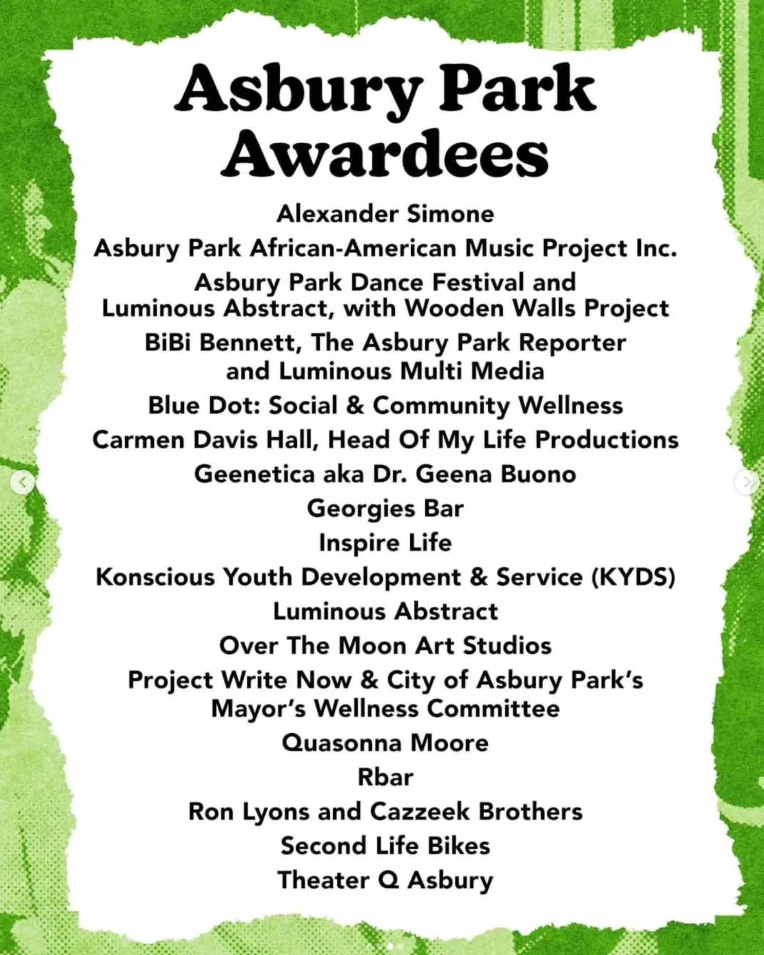 Asbury Park Chamber of Commerce, Jules Plangere Jr. Family Foundation, Manasquan Bank Charitable Foundation, McLoone’s Asbury Park, and Monmouth Arts, provided additional sponsorship and support, including ticket sales for the awards ceremony.