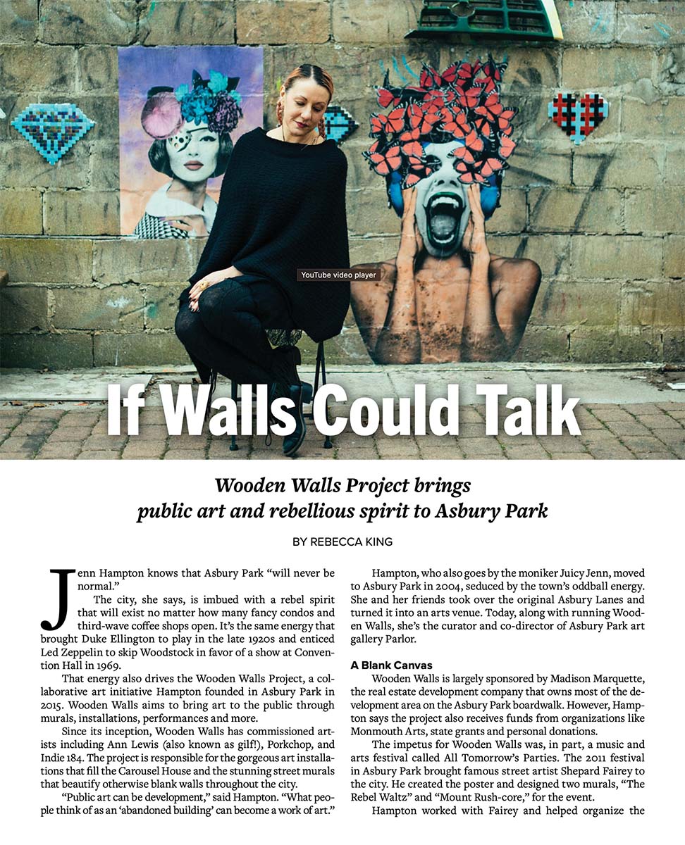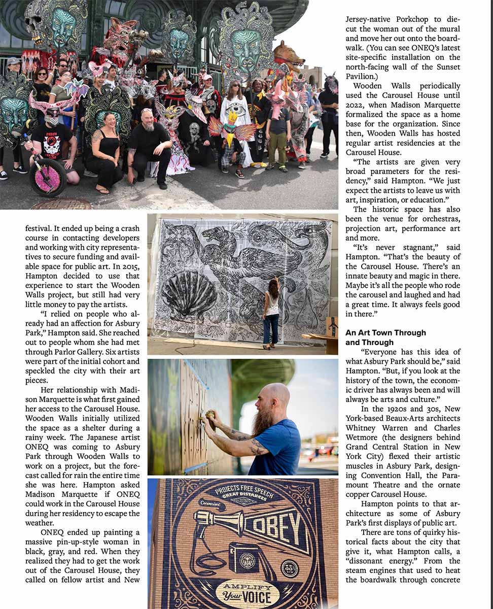 Since its inception in 2015, Wooden Walls, founded by Jenn Hampton, has cu-rated an evolving collection of murals along the Asbury Park Boardwalk in part-nership with boardwalk redeveloper Madison Marquette. The Asbury Park Arts Council, co-founded by Hampton, extends beyond boardwalk murals, advocating for and supporting the broader arts landscape throughout Asbury Park.