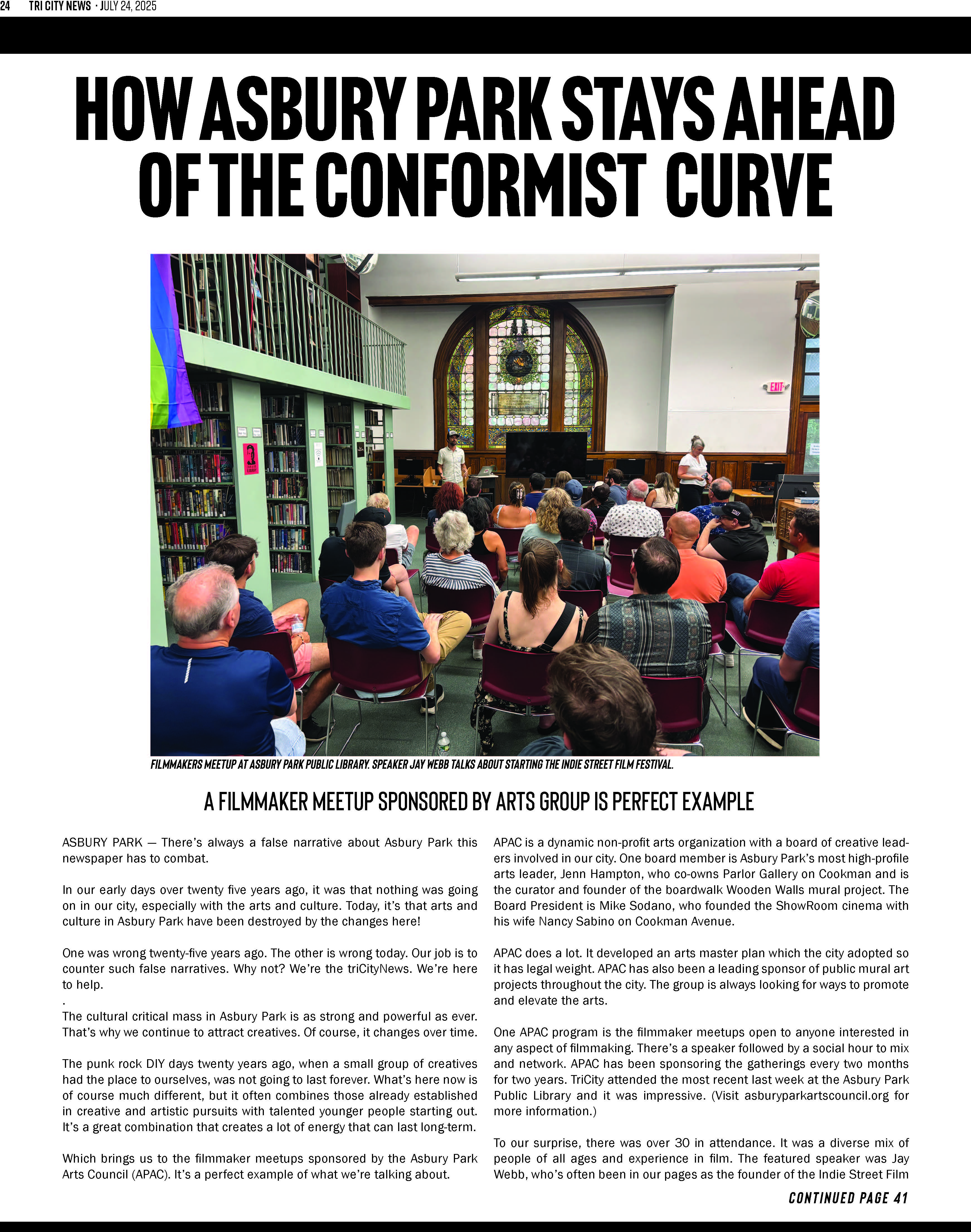 One APAC program is the filmmaker meetups open to anyone interested in any aspect of filmmaking. There’s a speaker followed by a social hour to mix and network. APAC has been sponsoring the gatherings every two months for two years. TriCity attended the most recent last week at the Asbury Park Public Library and it was impressive. (Visit asburyparkartscouncil.org for more information.)
